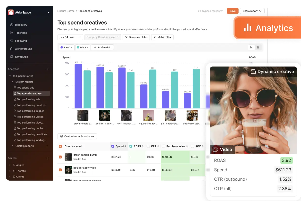 Inspiration Library: Atria maintains an extensive database of top-performing ads, enabling users to explore trends, identify effective strategies, and benchmark creative performance.