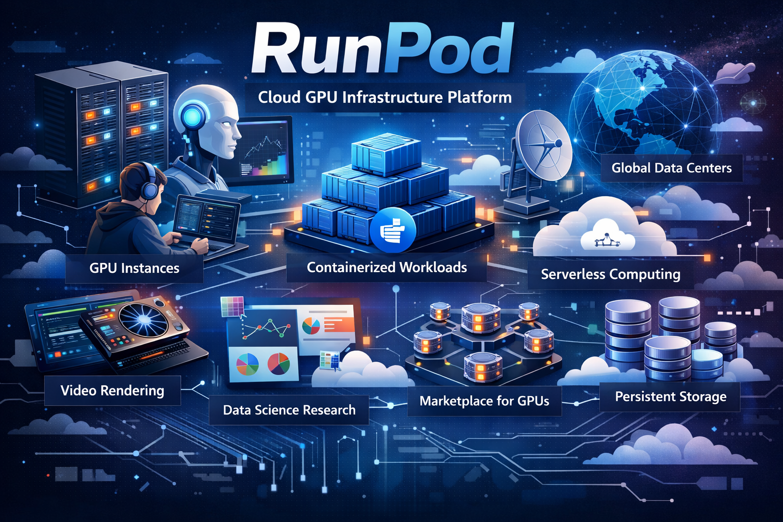 Unlike traditional cloud platforms that offer a broad range of services, RunPod primarily focuses on GPU-accelerated workloads. These workloads typically involve applications that benefit from massive parallel processing, such as neural network training, scientific simulations, data analysis pipelines, and graphics rendering.