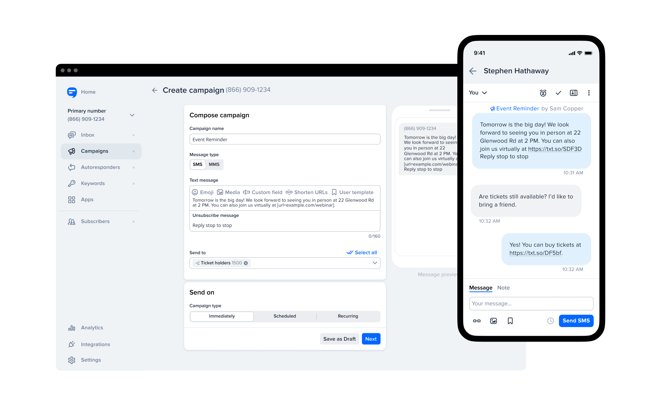 Gone are the days of one-sided messaging. SimpleTexting enables two-way texting, allowing businesses to respond to customer inquiries in real-time. Features like auto-replies, templates, and scheduled messages streamline conversations, making it simple to maintain high levels of customer engagement without overwhelming your team.